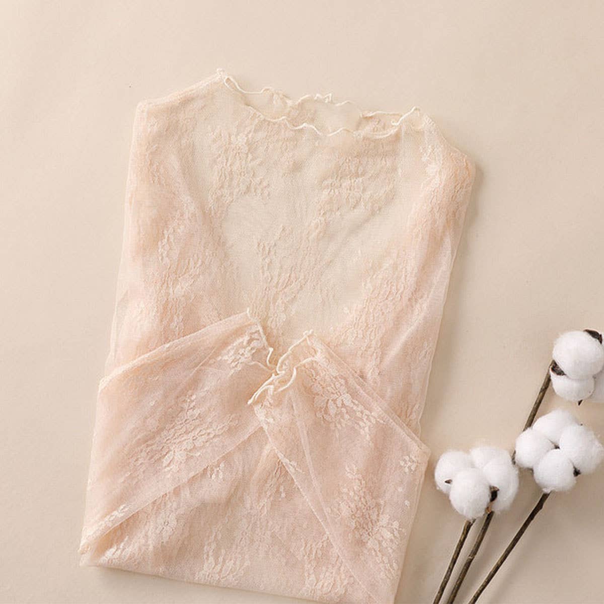 A whisper of texture, a silhouette that speaks volumes. This long-sleeve pullover blouse is a study in subtle contrasts—solid-toned lace stitched with collage craftsmanship, creating depth without distraction. The half-high collar adds a touch of refinement, while the sheer finish invites layering and light play. Available in four earthy tones—White, Black, Apricot, and Coffee—each one evokes a different mood: crisp, bold, warm, grounded.