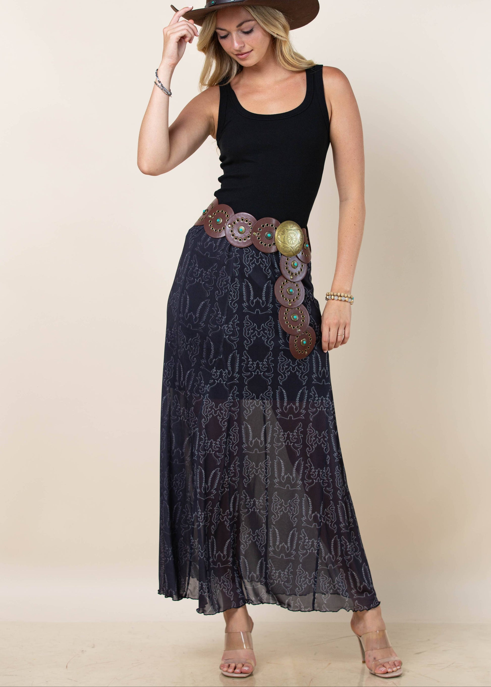 Let your style roam free with this enchanting maxi skirt, where bohemian grace meets effortless sophistication. Crafted from a soft, flowing fabric that moves with you, its deep charcoal hue offers a versatile canvas for bold accessorizing or minimalist pairings. The silhouette is long and lean, designed to flatter while offering comfort and ease. Pair it with a fitted tank and statement belt for a look that’s confidently bold, or dress it down with a cozy knit and boots for cooler days.