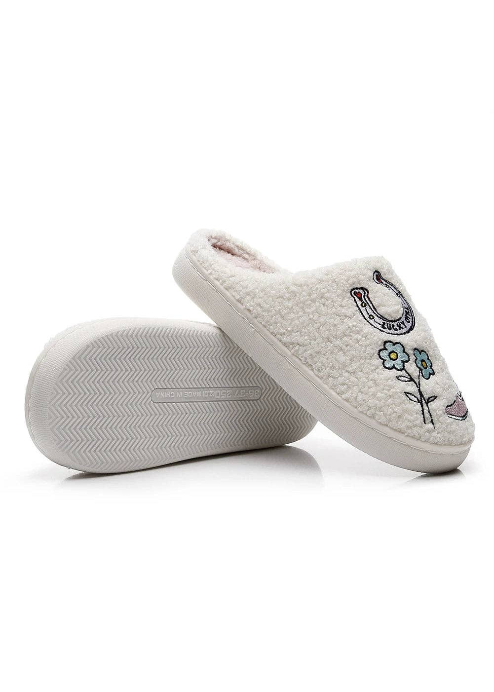Kick back in Western whimsy with the Lucky Lounge Slippers—a plush pair that brings comfort, character, and cowgirl flair to your off-duty style. Each slipper features unique embroidered details, from cowboy boots and hats to lucky dice and lightning bolts, making every step a statement.
